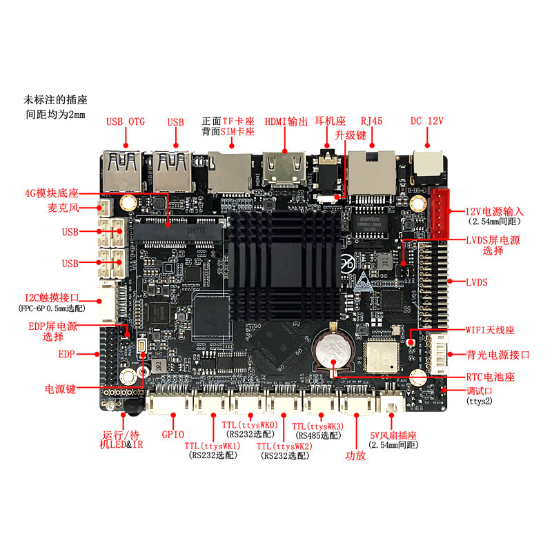 1 个外置 DC12V 输入插座(DC-5.5*2.5MM 母座),一个 6P 输入插座(2.54mm-6P 插座)