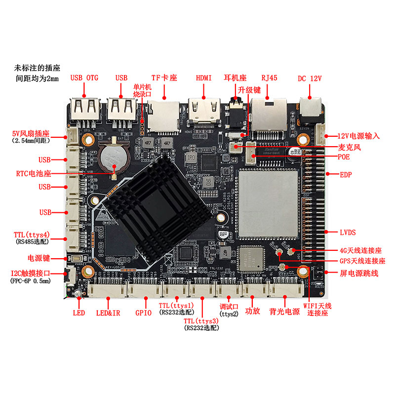 2 个 USB,1 个外置标准 USB 座子+1 个 2.0mm-4P 插座,用于外接高清 USB 摄像头、U 盘、键盘鼠标等设备